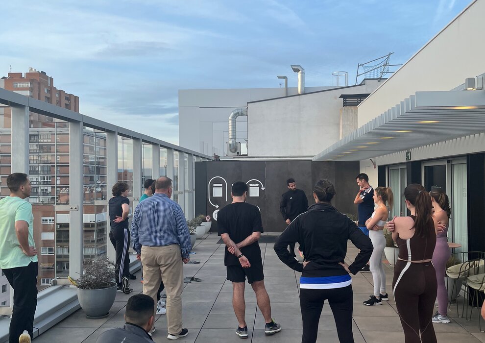 A one-hour functional training session on the rooftop of the Check24 office in Madrid. Fresh air, city views and a coach from Fit&Coach who made sure nobody coasted through it.